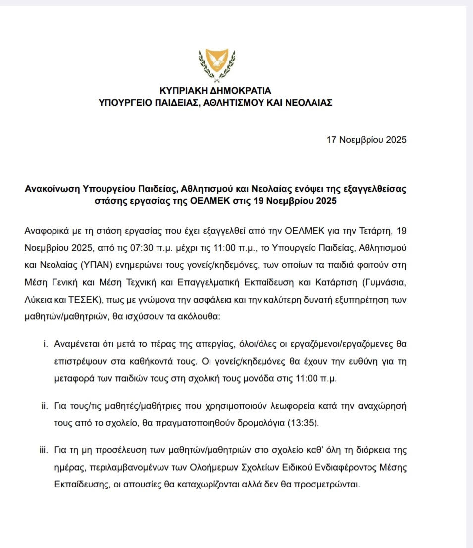 Ανακοίνωση του Υπουργείου Παιδείας, Αθλητισμού και Νεολαίας ενόψει της εξαγγελθείσας στάσης εργασίας της ΟΕΛΜΕΚ στις 19 Νοεμβρίου 2025