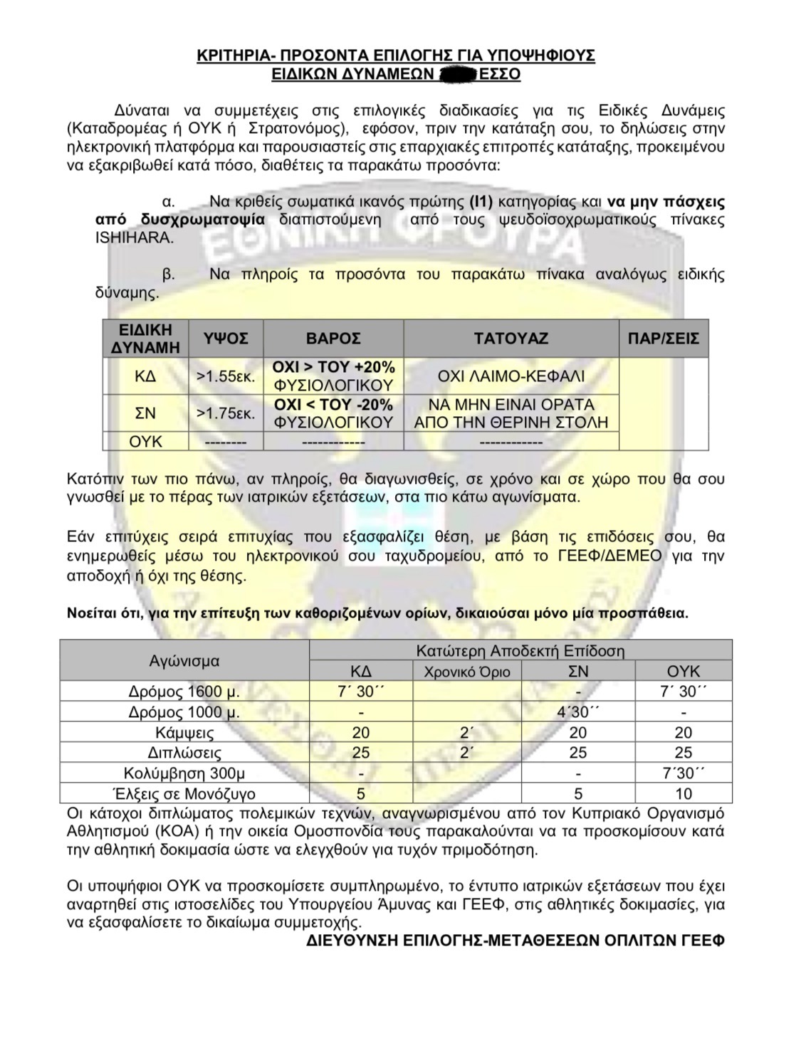 Σας ενημερώνουμε πως οι δοκιμασίες για όσους δηλώσουν επιλογή για Ειδικές Δυνάμεις και Υποψηφίους Βαθμοφόρους (Δόκιμοι) έχουν ως εξής: