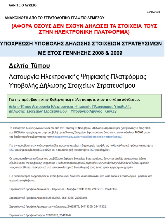 ΑΝΑΚΟΙΝΩΣΗ ΑΠΟ ΤΟ ΣΤΡΑΤΟΛΟΓΙΚΟ ΓΡΑΦΕΙΟ ΛΕΜΕΣΟΥ (ΑΦΟΡΑ ΟΣΟΥΣ ΔΕΝ ΕΧΟΥΝ ΔΗΛΩΣΕΙ ΤΑ ΣΤΟΙΧΕΙΑ ΤΟΥΣ ΣΤΗΝ ΗΛΕΚΤΡΟΝΙΚΗ ΠΛΑΤΦΟΡΜΑ)